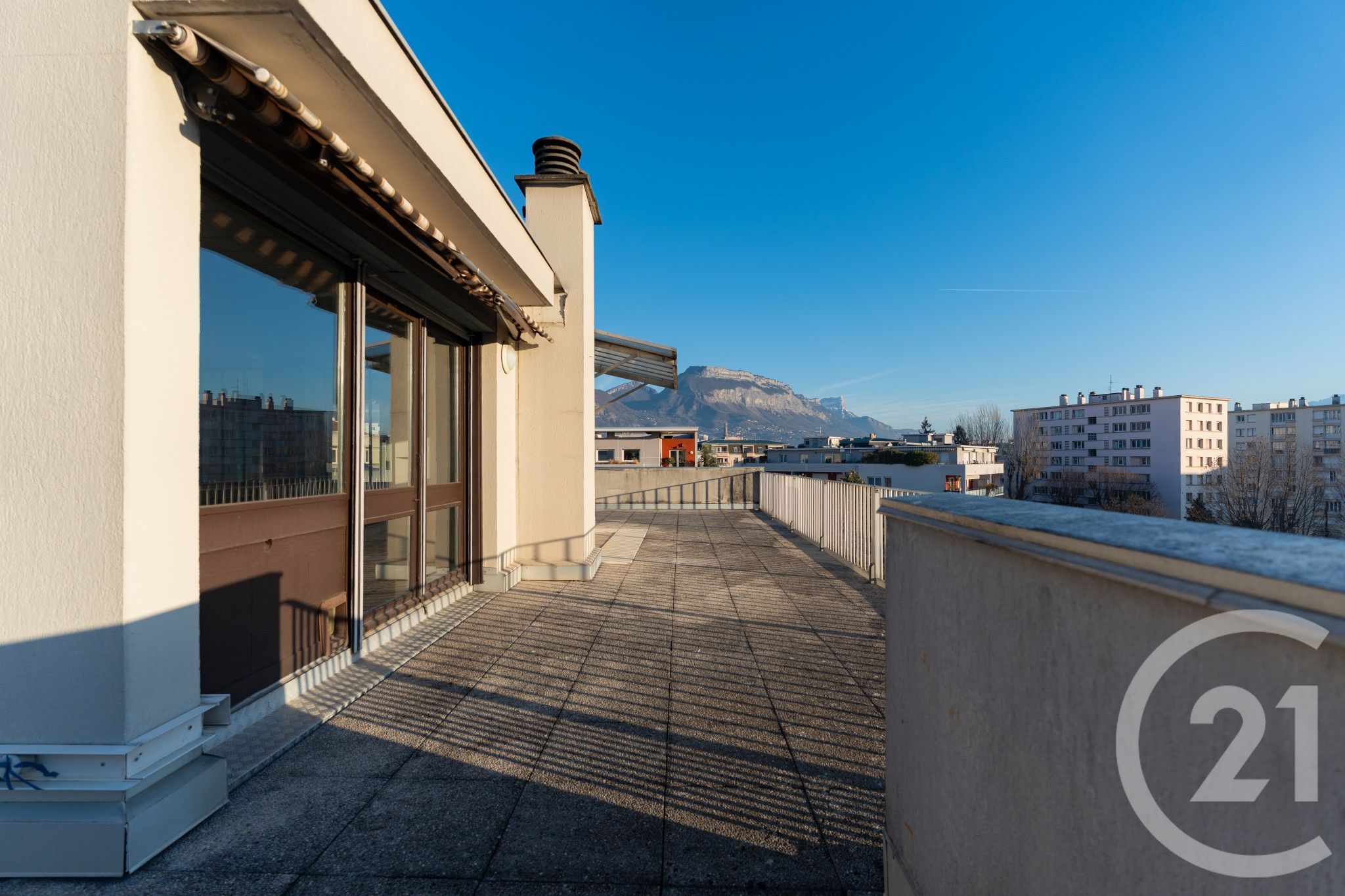 Cuisine et salon bénéficient de larges baies vitrées donnant accès à la terrasse et à une vue dégagée sur l'ensemble des massifs grenoblois.